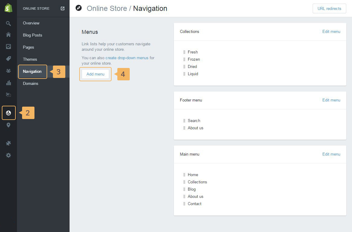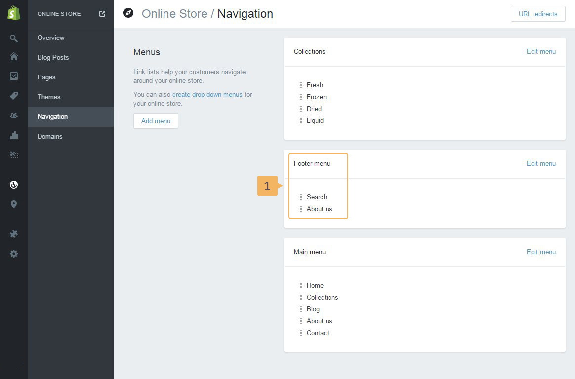 Footer navigation makes it easy for users to navigate their way around. Shopify has created default footer menu when you made a store (Fig. 2.18 - [ 1 ]). You can change default items and add a new item to this footer menu. How to change and add menu items in the footer is described later in this documentation.