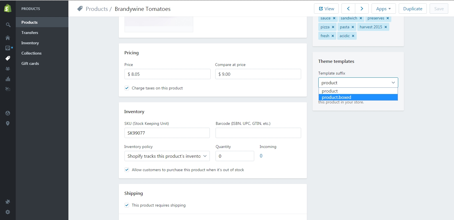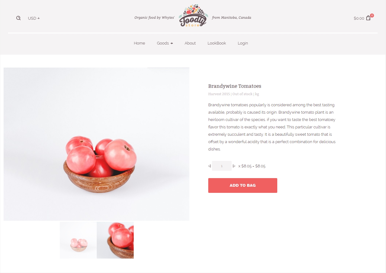 By default, the product page has view as on Fig. 3.3. But, Foodly Theme has an alternative view - boxed (Fig. 3.4). To apply this view - choose product.boxed template on the product page in your admin panel (Fig. 3.5).