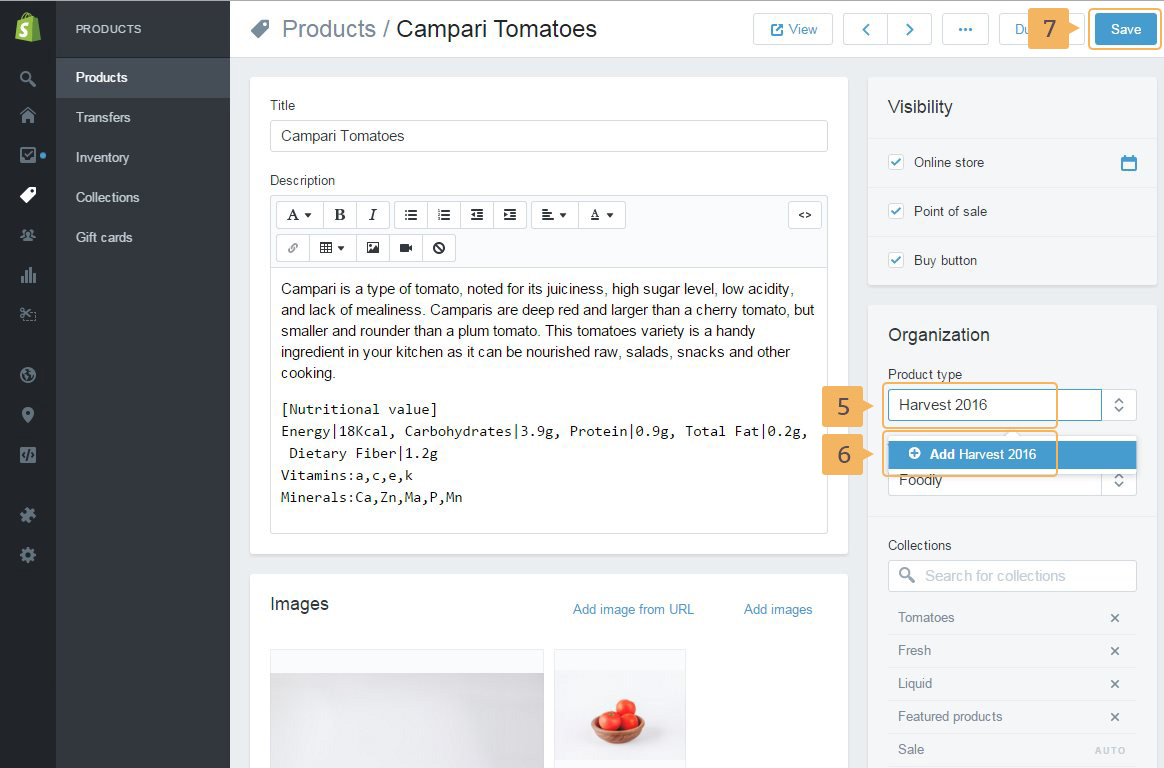 In the right sidebar menu 'Organization', type product type in 'Product type' input (Fig. 3.13 - [ 5 ]) and click 'Add your product type' (Fig. 3.13 - [ 6 ])