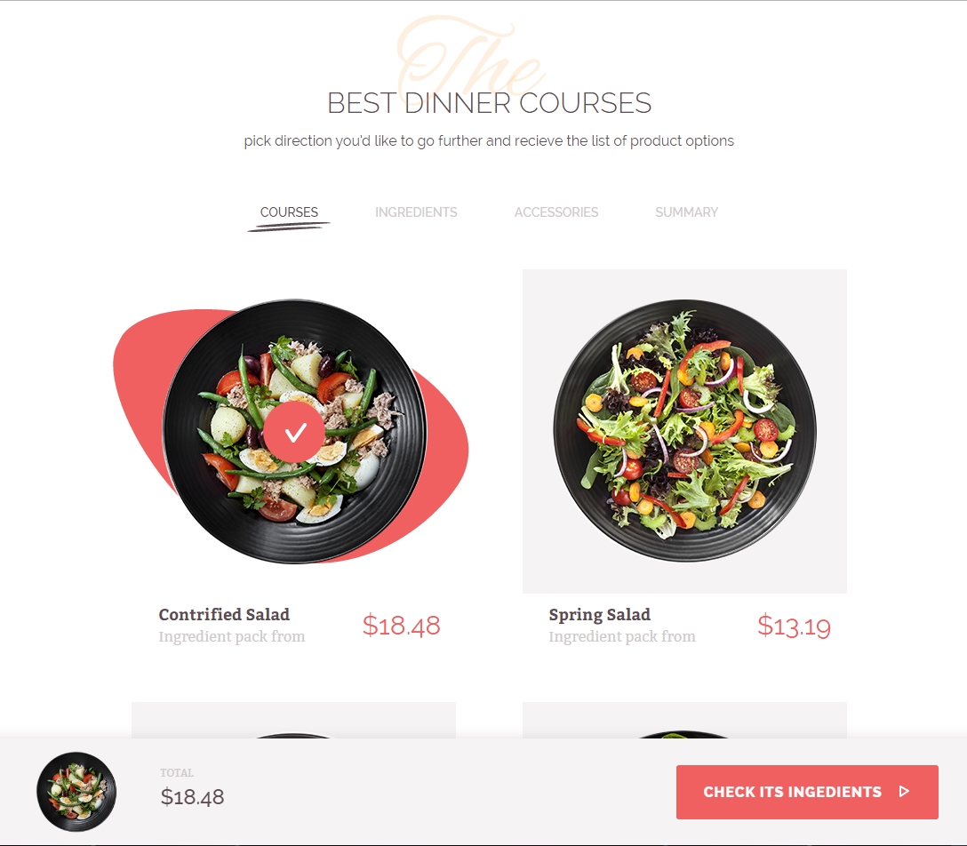 Product builder is useful shopping tool, it allows potential customers to “build” an ideal version of a product by combining different options. At the end of this process, the user is given an action to buy the product.