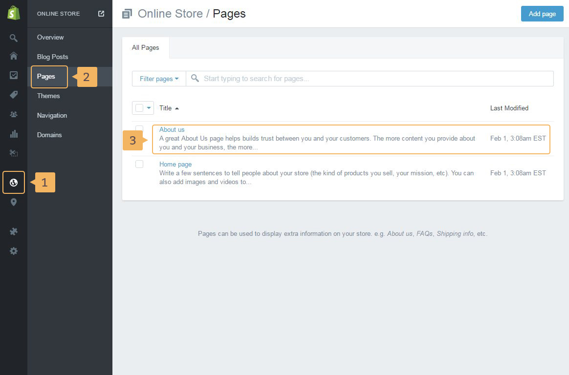 Shopify creates 'About us' page by default. To change this page, please, go through the following steps: