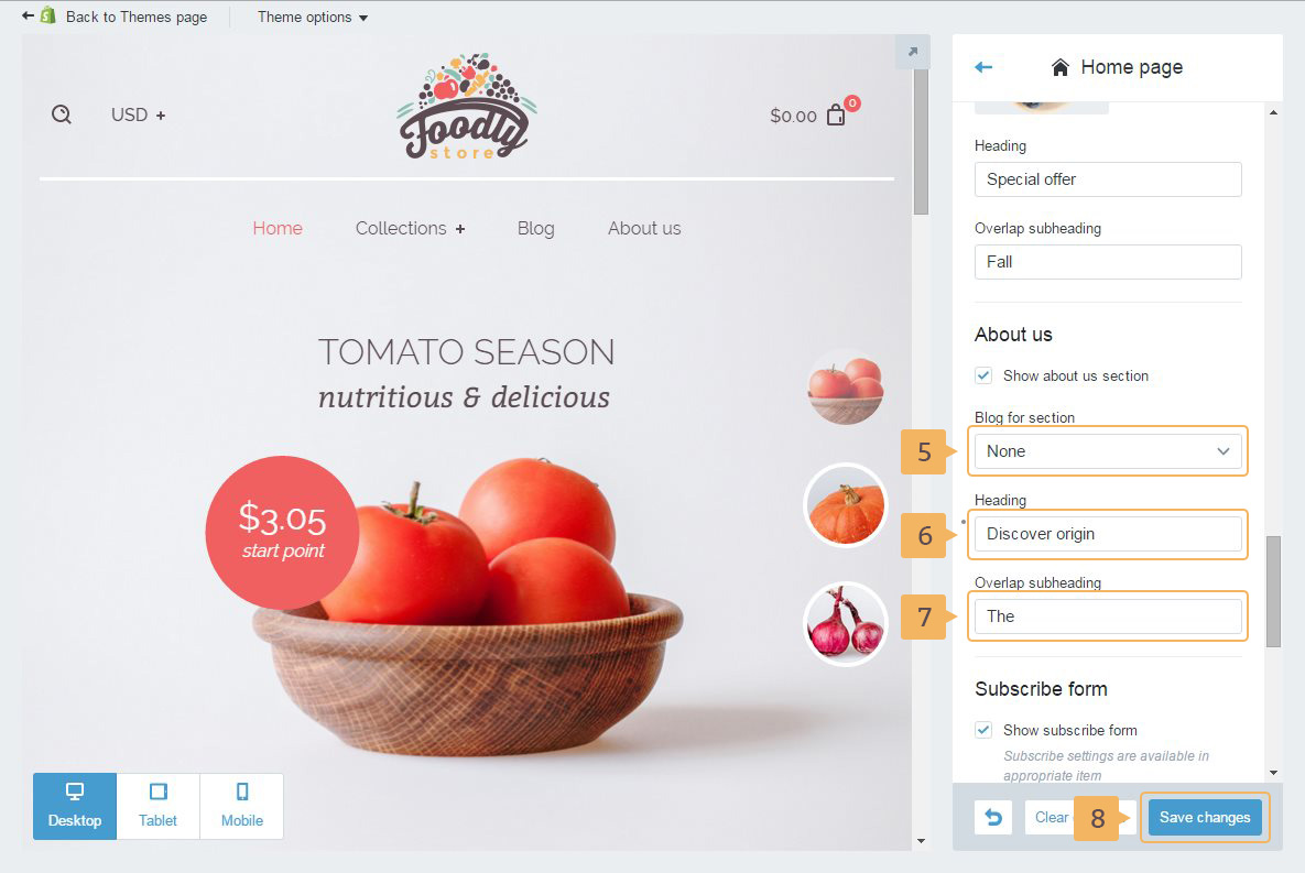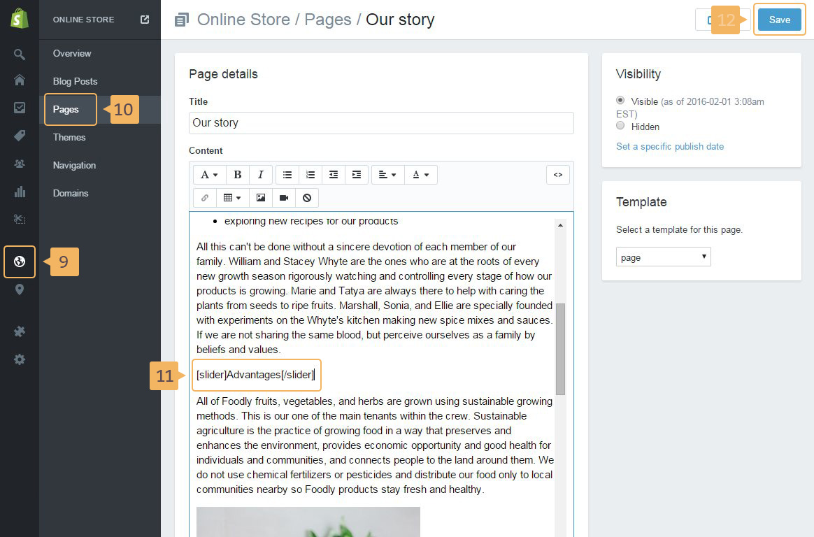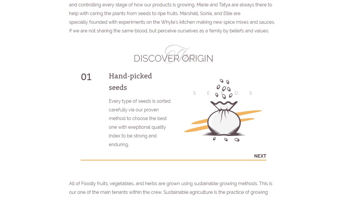 You can improve your story on the page 'About us' by adding the slider with either advantages and features, or the crusial stages of your production as Foodly theme has shown. The preview of this slider is in Figure 5.22. How to customize slider will be considered in Theme customization section. How to enable and use of the slider on 'About us' page is uncovered in the instruction below: