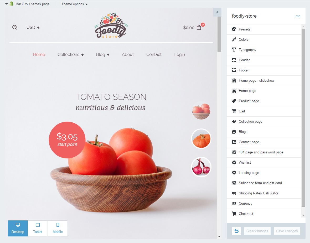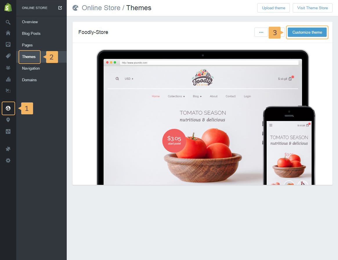 'Theme settings' page is your start point in the fascinating process of customization. Tinker here, tinker there. This is what for you need this section in your Shopify admin. It helps to insert your content, to adjust branding and to set up functionality. All these options are grouped into sections in Foodly theme, so you can't be lost among long list of features to adjust. Here's how this list looks like — Figure 1.2, please go through the following steps: