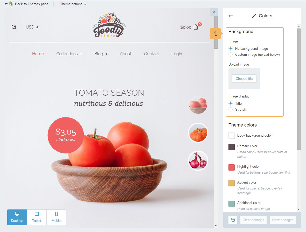 'Colors' section is one of the primary visual setting to start adjusting from. It defines the overal mood and general look of your store. Foodly theme has three sections that helps you make changes of the elements colors: