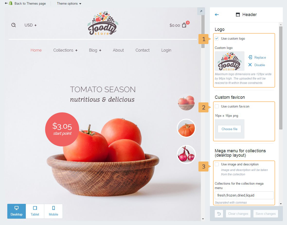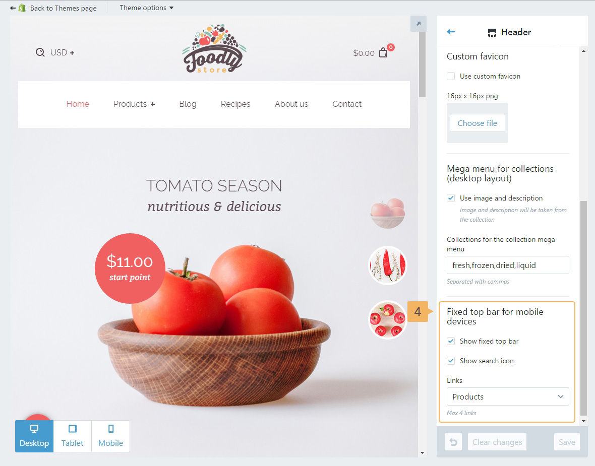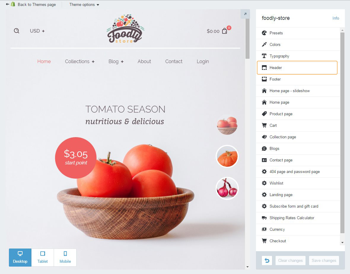 Header - part of a site with a main menu, logo, cart, search and currency. It is global all over the site. It should contain information that can be needed as help guide in navigating the store. Foodly header can be adjusted in special settings section 'Header'. Here's what you can change: