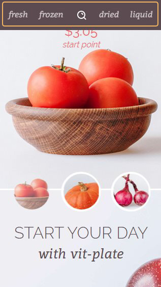 'Fixed top bar for mobile devices' (Fig. 5.3 - [ 4 ]). It is specially crafted navigation for mobile devices to enhance user experience on smaller screens. When space is an issue and scroll can be infinite it might be hard to get back to the main naviagtion. So we granted Foodly theme with a nifty solution that looks like this Figure 5.4 that helps browse main product collections swiftly.