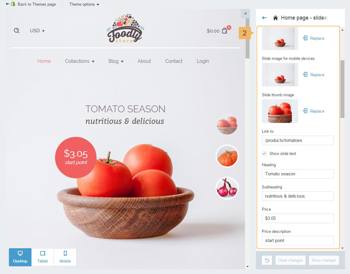 Foodly theme offers the following customization features for the slideshow: animation, autoplay, time of slide duration (Fig. 7.2 - [ 1 ]) and images with headings (Fig. 7.3 - [ 2 ]).