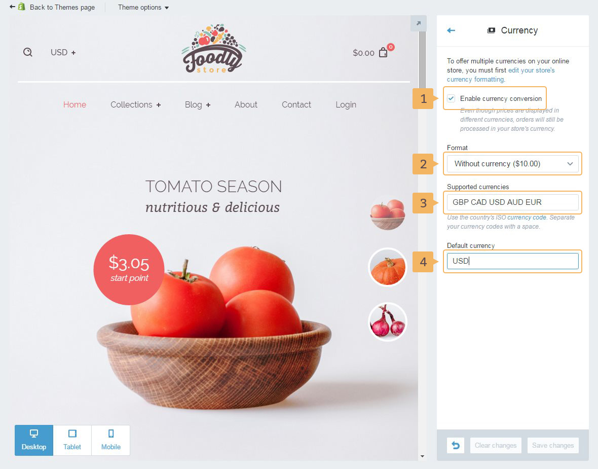 If you are selling abroad and your customers are using currency that differs from yours, you might be interested in adding an option to change them. If it is your case, you can enable currency select in 'Currency' section of 'Theme Settings'.