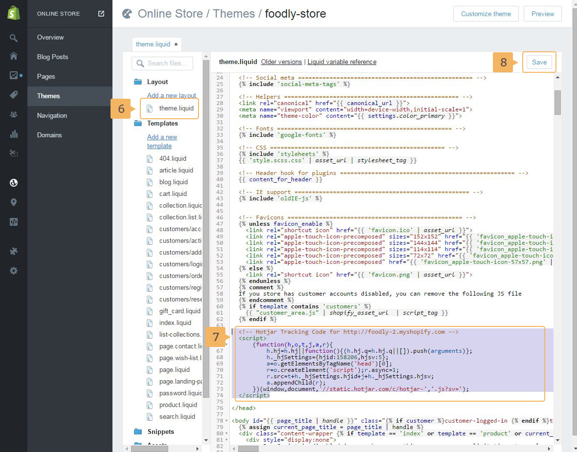 theme.liquidlayout file (Fig. 1.20 - [ 6 ]).head tag (Fig. 1.20 - [ 7 ]).Now you can check how users behave in store, what they are doing, what they are attacted with the most visiting your Hotjar account